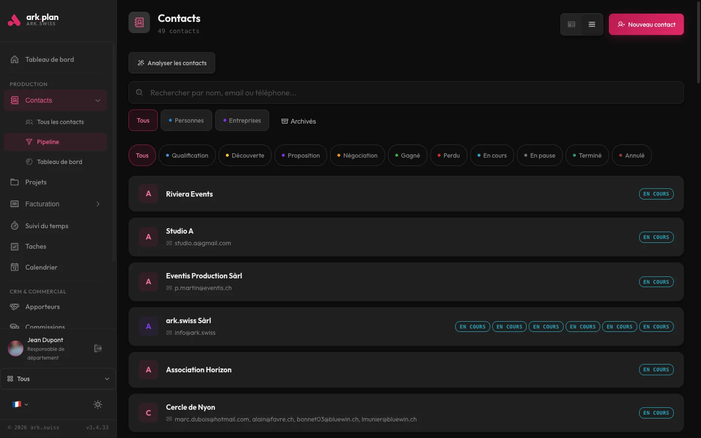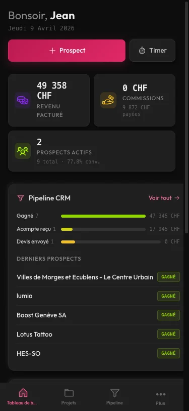 From lead to invoice — CRM, appointments, time tracking and analytics in one modular platform. Hosted in Switzerland, powered by AI.