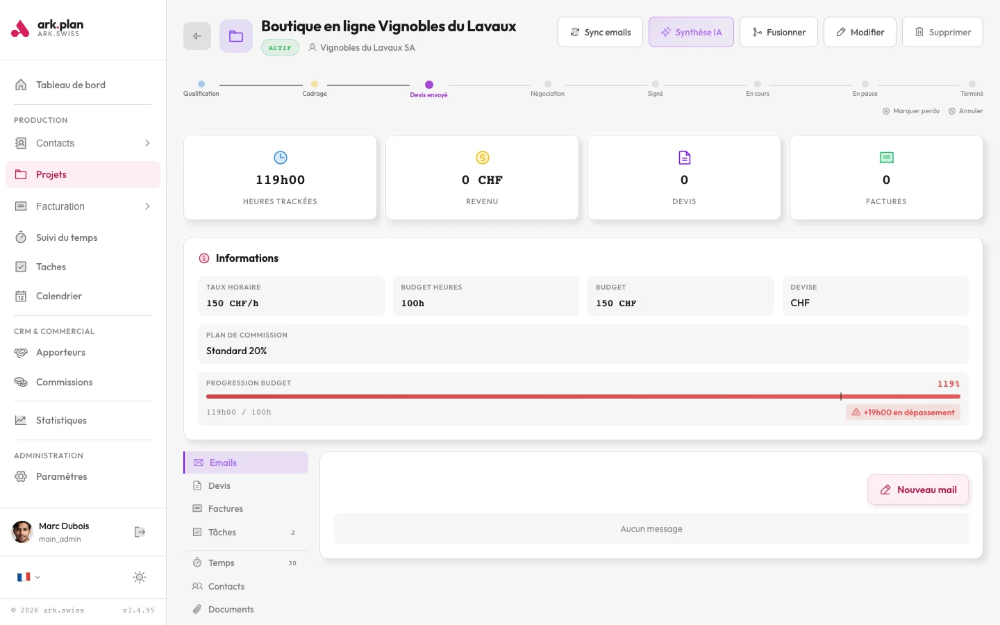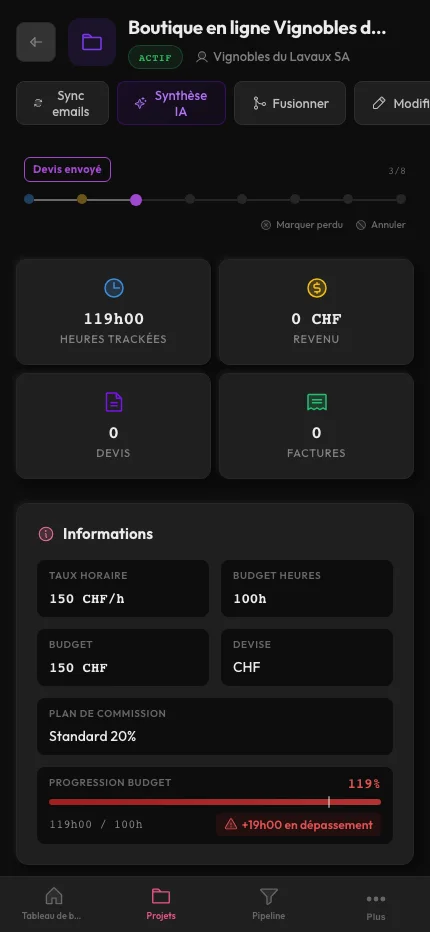 Le module Documents est inclus dès le plan Pro (39 CHF/mois). Il comprend l'upload de fichiers par projet et les liens Google Drive avec indexation.