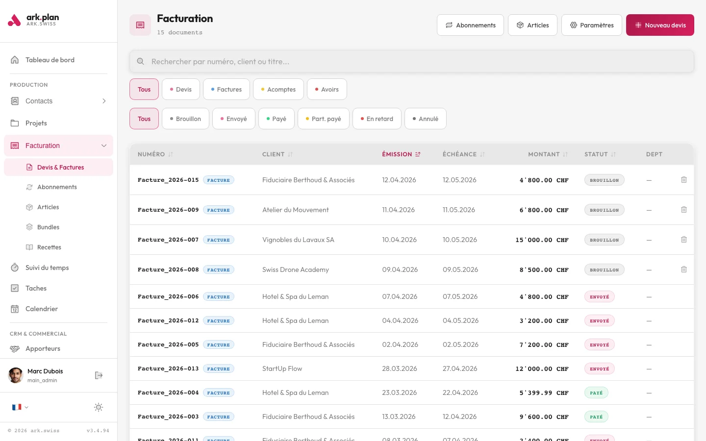 Depuis un contact et un projet, ark.plan récupère toutes les entries de time tracking non encore facturées et crée automatiquement les lignes de devis correspondantes avec la bonne description, la bonne quantité d'heures et le bon taux horaire. Une fois la facture envoyée, les entries sont marquées invoiced — impossible de les facturer deux fois.