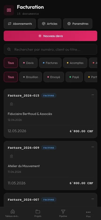 Créez un devis, convertissez-le en facture en un clic, enregistrez un acompte, encaissez le solde, créez une note de crédit si nécessaire — tout reste lié, versionné et traçable. Numérotation automatique avec pattern configurable ({YEAR}{PREFIX}{SEQ}). Lignes avec articles préparamétrés ou libres, rabais par ligne ou global, TVA configurable.