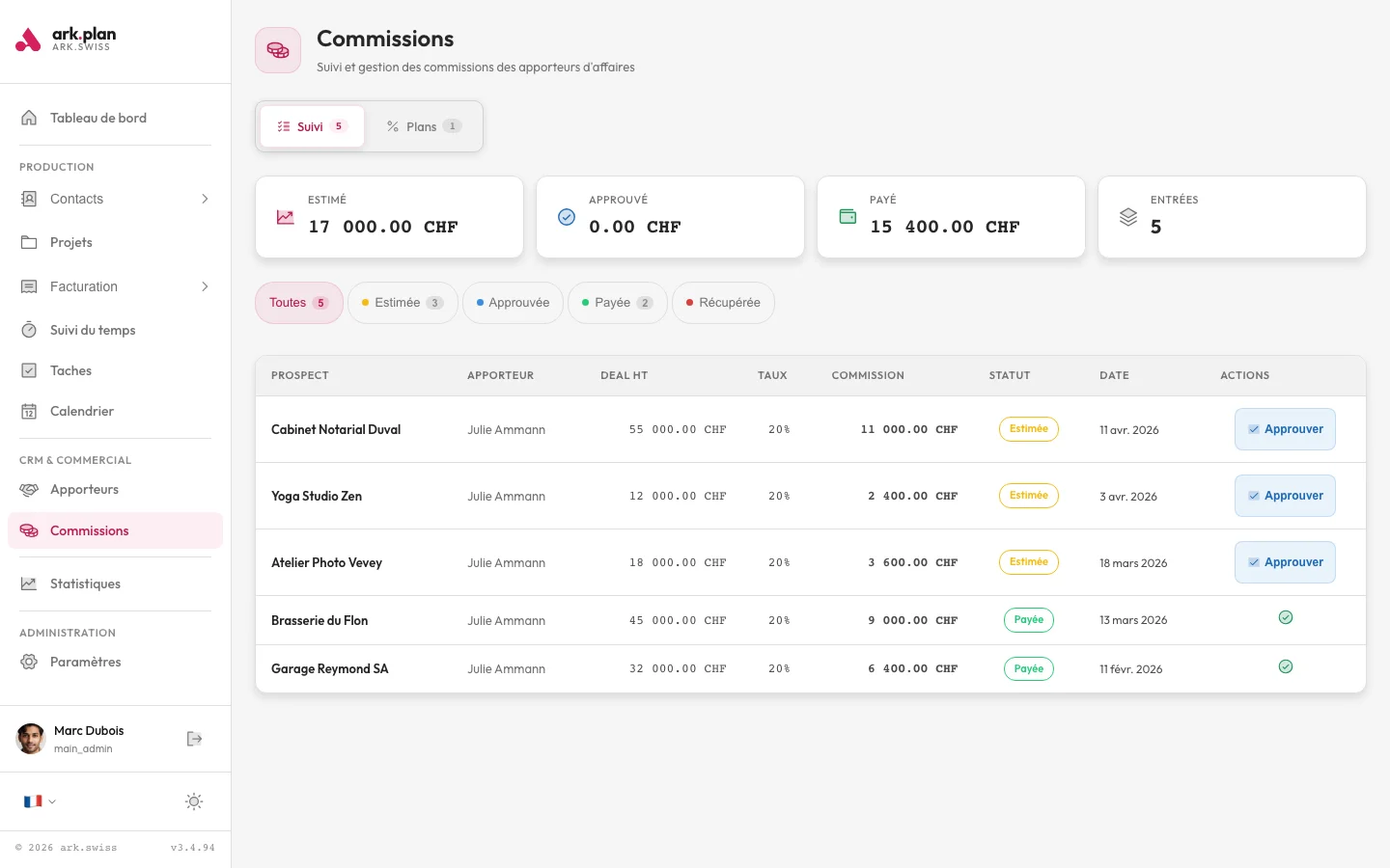 Le module Apporteurs d'affaires est inclus uniquement dans le plan Business (79 CHF/mois). Il comprend les plans de commission, les SPIFFs, le calcul automatique, le dashboard par apporteur, la sync ArkAV et l'export Odoo.