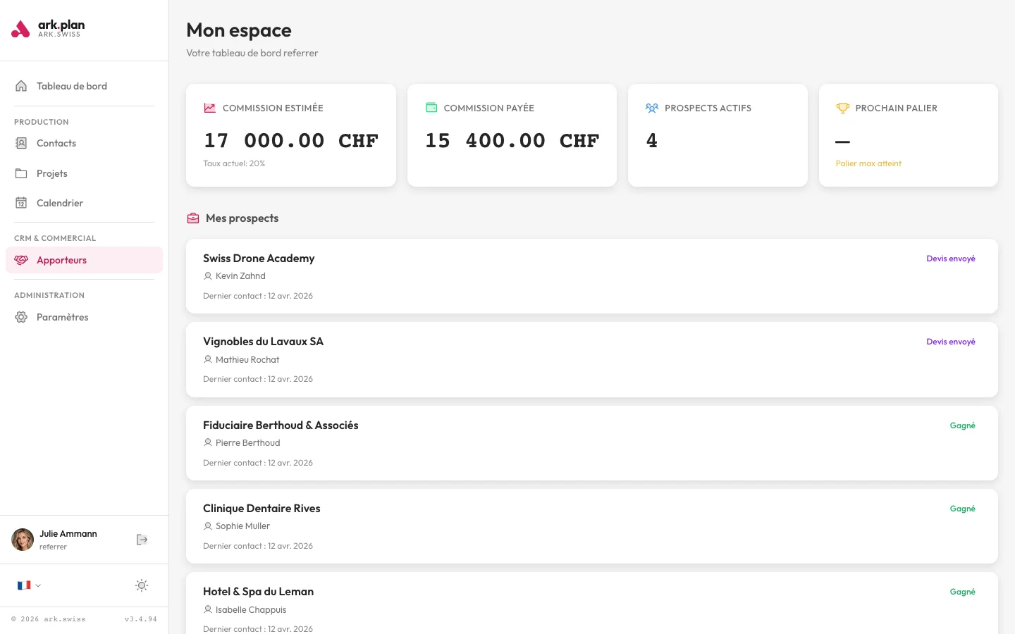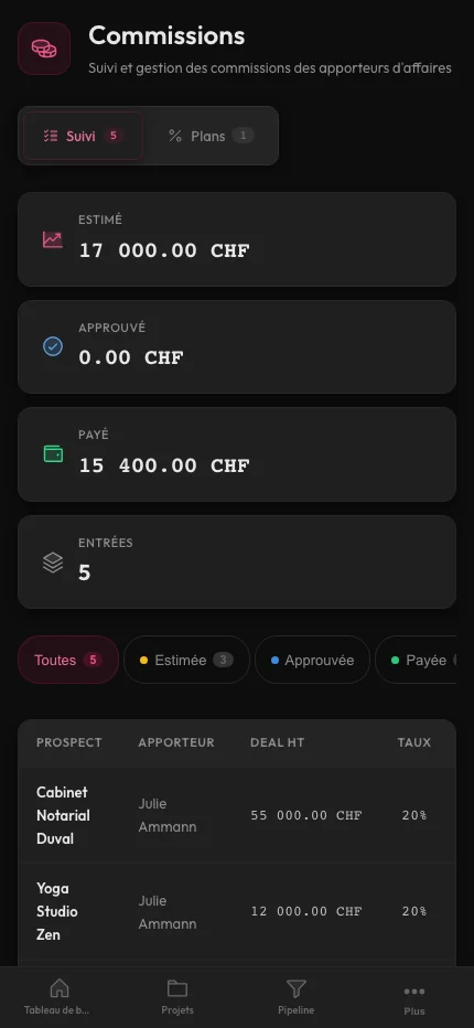 - Dashboard par apporteur : prospects, conversion, commissions