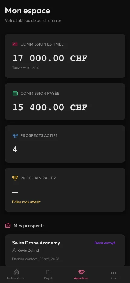 Oui. Un apporteur peut avoir son propre accès limité à son dashboard (ses prospects, ses commissions estimées, ses payouts). Il ne voit que ses propres données, pas celles des autres apporteurs ni les finances globales. -